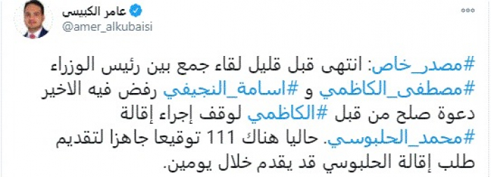 وقال في تغريدة عبر "تويتر" رصدها "المشهد العربي": "مصدر خاص: انتهى قبل قليل لقاء جمع بين رئيس الوزراء مصطفى الكاظمي وأسامة النجيفي رفض فيه الأخير دعوة صلح من قبل الكاظمي لوقف إجراء إقالة محمد_الحلبوسي".