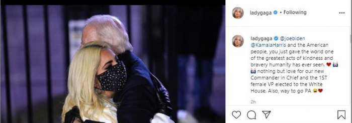 النجمة ليدي جاجا نشرت عبر "إنستجرام" صورة لجو بايدن وهو يحتضن نائبته كامالا هاريس، وعلّقت: "بايدن وهاريس والشعب الأمريكي، لقد أعطيتم العالم للتو واحدة من أعظم أعمال الشجاعة التي شهدتها البشرية على الإطلاق.. لا شيء سوى الحب لقائدنا الجديد والنائبة الأولى المنتخبة للبيت الأبيض".