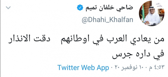 وقال خلفان في تغريدة له عبر حسابه بتويتر ورصدها "المشهد العربي" أن "من يعادي العرب في أوطانهم، دقت الإنذار في داره جرس".