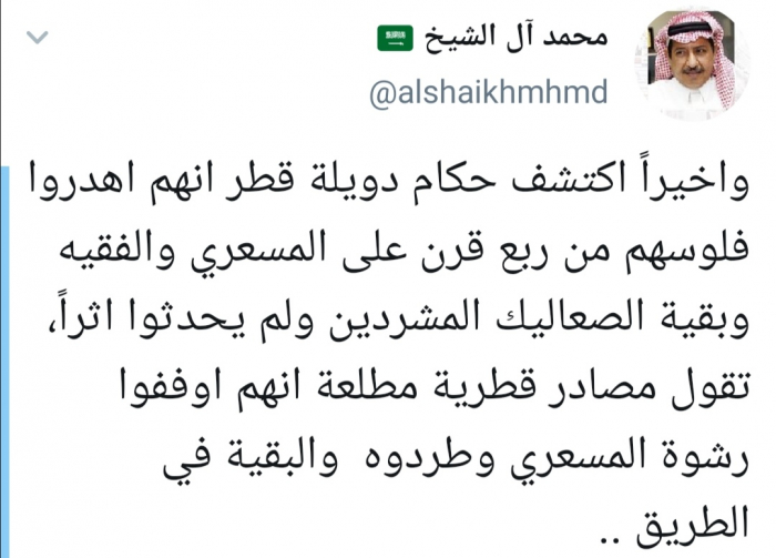 وأضاف آل الشيخ في تغريدة له عبر "تويتر" رصدها "المشهد العربي": "تقول مصادر قطرية مطلعة أنهم أوقفوا رشوة المسعري وطردوه والبقية في الطريق".