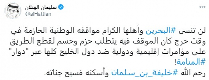 وقال في تغريدة عبر "تويتر" رصدها "المشهد العربي": "لن تنسى البحرين وأهلها الكرام مواقفه الوطنية الحازمة في وقت حرج كان الموقف فيه يتطلب حزم وحسم لقطع الطريق على مؤامرات إقليمية ودولية ضد دول الخليج كلها عبر دوار المنامة! رحم الله خليفة بن سلمان وأسكنه فسيح جناته".