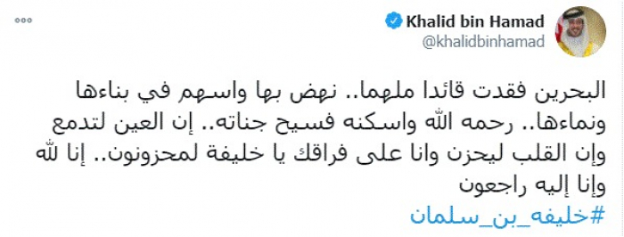 وقال في تغريدة عبر "تويتر" رصدها "المشهد العربي": "البحرين فقدت قائدا ملهما.. نهض بها واسهم في بناءها ونماءها.. رحمه الله واسكنه فسيح جناته.. إن العين لتدمع وإن القلب ليحزن وانا على فراقك يا خليفة لمحزونون.. إنا لله وإنا إليه راجعون خليفة بن سلمان".