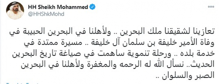 وقال في تغريدة عبر "تويتر" رصدها "المشهد العربي": " تعازينا لشقيقنا ملك البحرين .. ولأهلنا في البحرين الحبيبة في وفاة الأمير خليفة بن سلمان آل خليفة .. مسيرة ممتدة في خدمة بلده .. ورحلة تنموية ساهمت في صياغة تاريخ البحرين الحديث.. نسأل الله له الرحمه والمغفرة ولأهلنا في البحرين الصبر والسلوان".