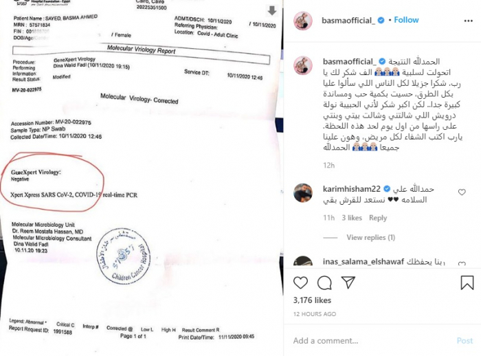 نشرت الفنانة المصرية بسمة صورة من نسخة المسحة الثانية التي أجرتها للكشف عن فيروس كورونا بعد إعلان إصابتها مؤخرًا.