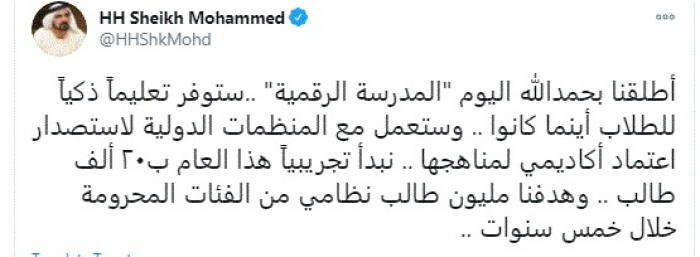 وقال في تغريدات عبر "تويتر" رصدها "المشهد العربي": "أطلقنا بحمدالله اليوم المدرسة الرقمية.. ستوفر تعليماً ذكياً للطلاب أينما كانوا. وستعمل مع المنظمات الدولية لاستصدار اعتماد أكاديمي لمناهجها.. نبدأ تجريبياً هذا العام ب٢٠ ألف طالب.. وهدفنا مليون طالب نظامي من الفئات المحرومة خلال خمس سنوات".