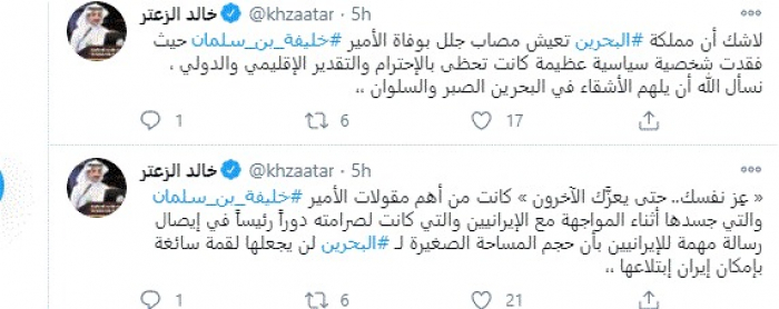 وكتب في تغريدات عبر "تويتر" رصدها "المشهد العربي": "عِز نفسك.. حتى يعزَّك الآخرون كانت من أهم مقولات الأمير خليفة بن سلمان والتي جسدها أثناء المواجهة مع الإيرانيين والتي كانت لصرامته دوراً رئيساً في إيصال رسالة مهمة للإيرانيين بأن حجم المساحة الصغيرة للبحرين لن يجعلها لقمة سائغة بإمكان إيران ابتلاعها".