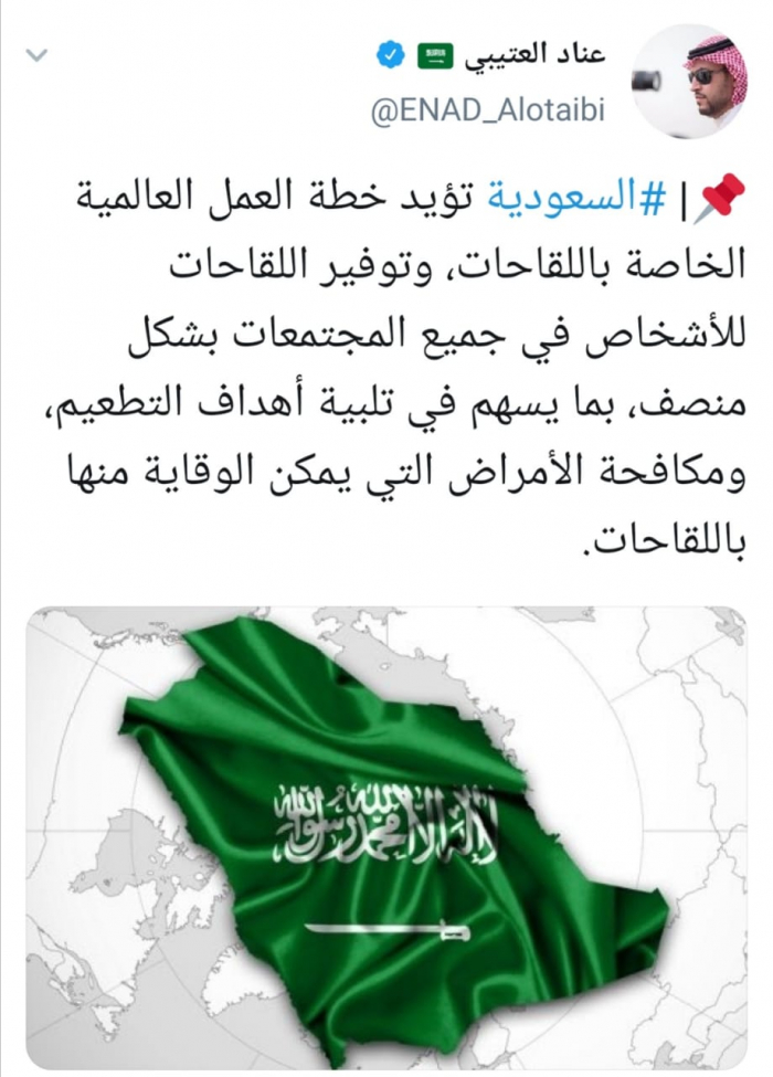 وقال العتيبي في تغريدة له عبر حسابه بتويتر ورصدها المشهد العربي: "السعودية تؤيد خطة العمل العالمية الخاصة باللقاحات، وتوفير اللقاحات للأشخاص في جميع المجتمعات بشكل منصف، بما يسهم في تلبية أهداف التطعيم، ومكافحة الأمراض التي يمكن الوقاية منها باللقاحات".