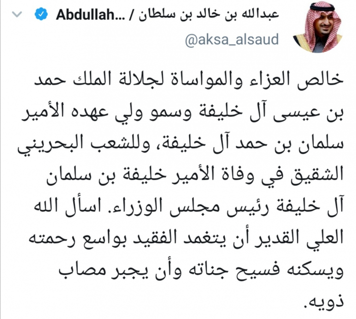 وقال الأمير عبدالله في تغريدة له عبر حسابه بتويتر ورصدها المشهد العربي: "خالص العزاء والمواساة لجلالة الملك حمد بن عيسى آل خليفة وسمو ولي عهده الأمير سلمان بن حمد آل خليفة، وللشعب البحريني الشقيق في وفاة الأمير خليفة بن سلمان آل خليفة رئيس مجلس الوزراء".