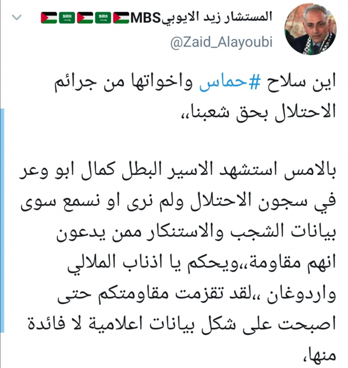 وتساءل الأيوبي عبر تغريدة له على "تويتر" رصدها " المشهد العربي": "أين سلاح حماس وأخواتها من الجرائم بحق شعبنا"؟