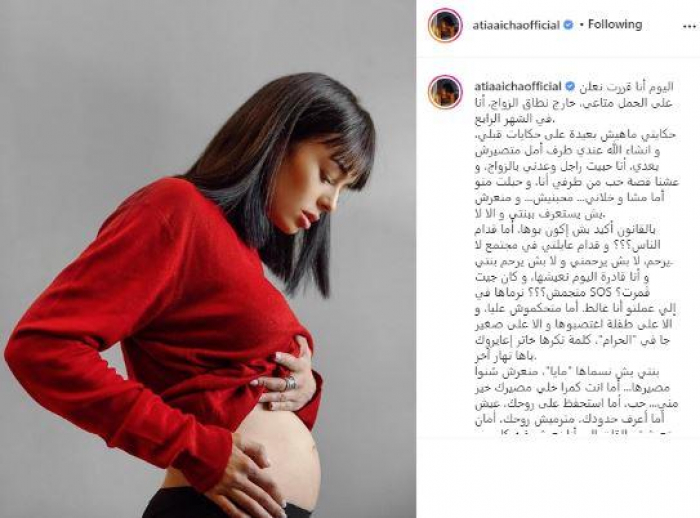 وقالت عائشة، عبر حسابها على إنستجرام: "أنا قررت أعلن عن الحمل بتاعي، خارج نطاق الزواج .. أنا في الشهر الرابع.. حكايتي ماهيش بعيدة على حكايات قبلي، وإن شاء الله عندي طرف أمل متصيرش بعدي .. أنا حبيت رجل وعدني بالزواج، وعشنا قصة حب من طرفي أنا، وحبلت منه، وهو مشي وخلاني (تركني)، محبنيش، وما أعرفش هو يريد يعترف ببنتي ولا لا".