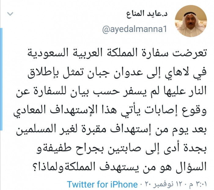 وقال المناع في تغريدة له عبر حسابه بتويتر ورصدها المشهد العربي: "تعرضت سفارة المملكة العربية السعودية في لاهاي إلى عدوان جبان تمثل بإطلاق النار عليها لم يسفر حسب بيان للسفارة عن وقوع إصابات يأتي هذا الإستهداف المعادي بعد يوم من استهداف مقبرة لغير المسلمين بجدة أدى إلى صابتين بجراح طفيفة".