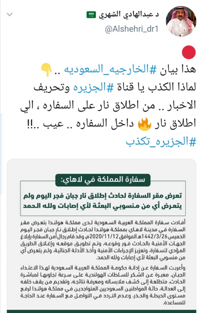 وتساءل الشهري في تغريدة له عبر "تويتر" رصدها "المشهد العربي" :" لماذا الكذب يا قناة الجزيرة وتحريف الأخبار.. من إطلاق نار على السفارة، إلى إطلاق نار داخل السفارة"، مختتما "عيب #الجزيرة_تكذب".