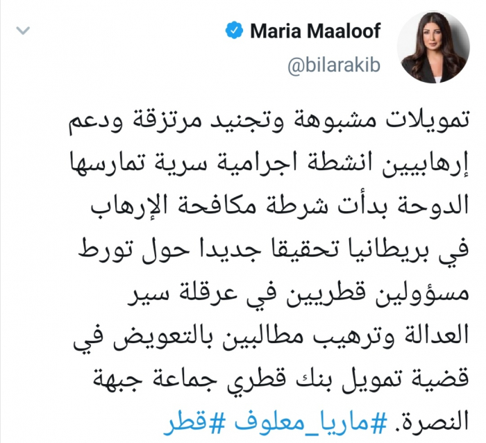 وقالت معلوف عبر تغريدة لها على "تويتر" رصدها " المشهد العربي": "تمويلات مشبوهة وتجنيد مرتزقة ودعم إرهابيين أنشطة إجرامية سرية تمارسها الدوحة".