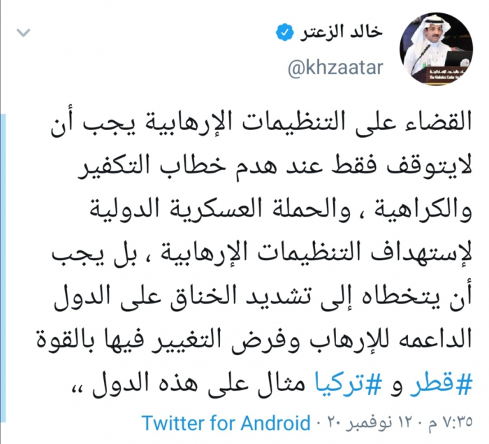 وأضاف الزعتر " بل يجب أن يتخطاه إلى تشديد الخناق على الدول الداعمة للإرهاب وفرض التغيير فيها بالقوة قطر وتركيا مثال على هذه الدول".