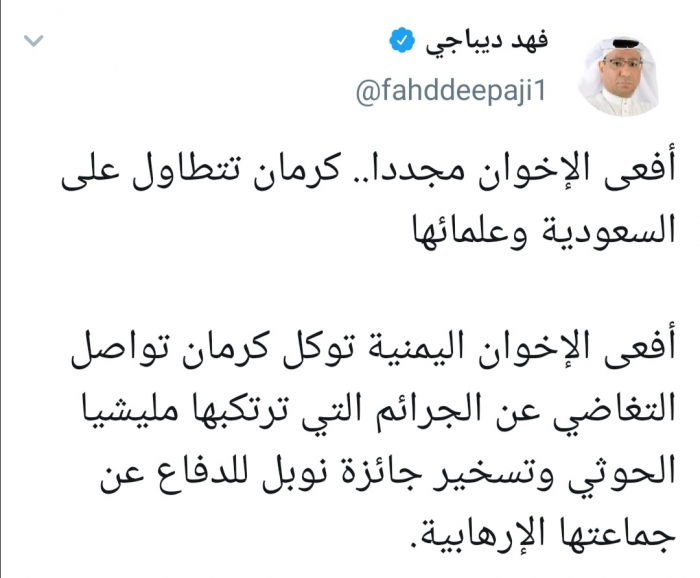 وقال ديباجي عبر حسابه في تويتر ورصدها "المشهد العربي": "أفعى الإخوان مجددا كرمان تتطاول على السعودية وعلمائها".