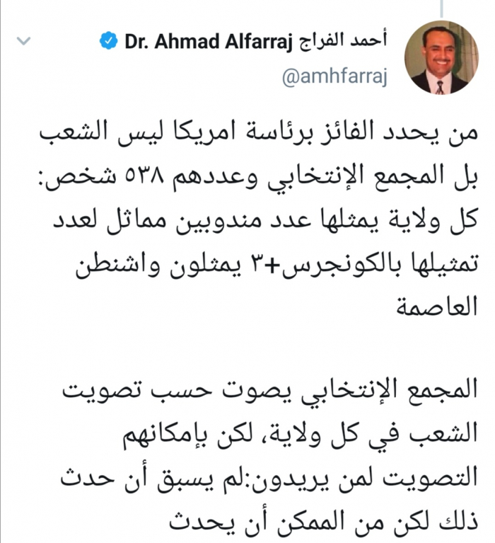 وقال الفراج عبر تغريدة له على حسابه بتويتر ورصدها "المشهد العربي": "من يحدد الفائز برئاسة امريكا ليس الشعب بل المجمع الإنتخابي وعددهم 538 شخص: كل ولاية يمثلها عدد مندوبين مماثل لعدد تمثيلها بالكونجرس+3 يمثلون واشنطن العاصمة".