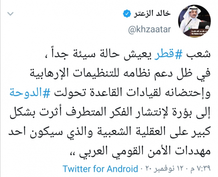 وأضاف الزعتر عبر تغريدة له على "تويتر" رصدها "المشهد العربي" :"تحولت الدوحة إلى بؤرة لإنتشار الفكر المتطرف أثرت بشكل كبير على العقلية الشعبية والذي سيكون أحد مهددات الأمن القومي العربي".