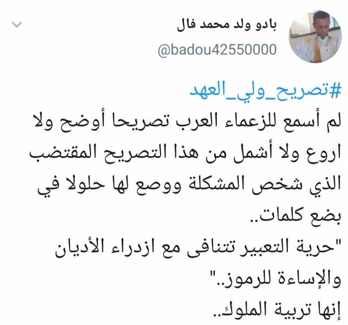 شارك الكاتب الصحفي الموريتاني بادو ولد محمد فال، في هاشتاج #تصريح_ولي_العهد، مؤكدا أنه تربية ملوك.