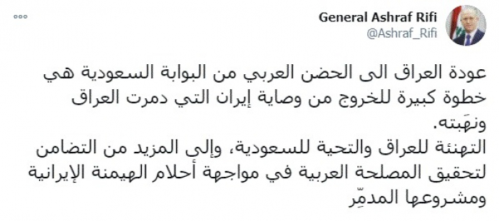 وقال في تغريدة عبر "تويتر" رصدها "المشهد العربي": "عودة العراق الى الحضن العربي من البوابة السعودية هي خطوة كبيرة للخروج من وصاية إيران التي دمرت العراق ونهَبته".