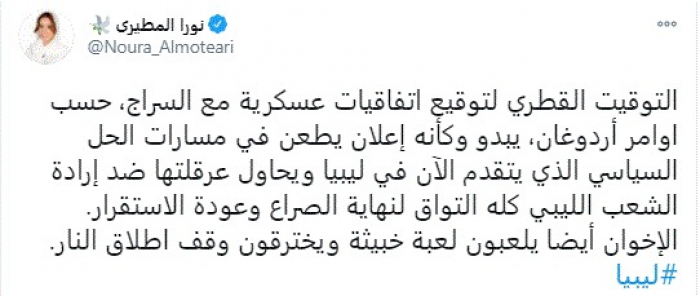 وقالت في تغريدة عبر "تويتر" رصدها "المشهد العربي": "التوقيت القطري لتوقيع اتفاقيات عسكرية مع السراج، حسب أوامر أردوغان، يبدو وكأنه إعلان يطعن في مسارات الحل السياسي الذي يتقدم الآن في ليبيا ويحاول عرقلتها ضد إرادة الشعب الليبي كله التواق لنهاية الصراع وعودة الاستقرار".