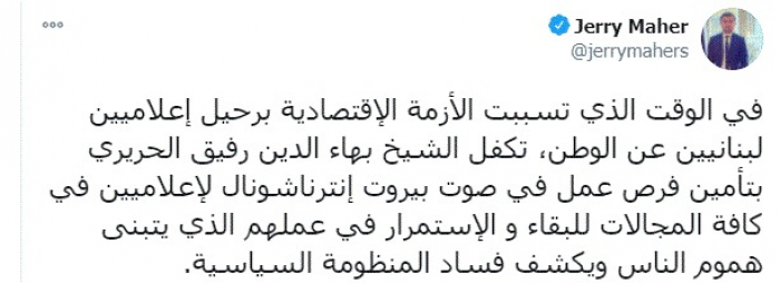 وقال في تغريدة عبر "تويتر" رصدها "المشهد العربي": "في الوقت الذي تسببت الأزمة الإقتصادية برحيل إعلاميين لبنانيين عن الوطن، تكفل الشيخ بهاء الدين رفيق الحريري بتأمين فرص عمل في صوت بيروت إنترناشونال لإعلاميين في كافة المجالات للبقاء و الإستمرار في عملهم الذي يتبنى هموم الناس ويكشف فساد المنظومة السياسية".