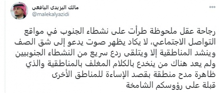 وقال في تغريدة عبر "تويتر" رصدها "المشهد العربي": "رجاحة عقل ملحوظة طرأت على نشطاء الجنوب في مواقع التواصل الاجتماعي، لا يكاد يظهر صوت يدعو إلى شق الصف وينشد المناطقية إلا ويتلقى ردع سريع من النشطاء الجنوبيين".