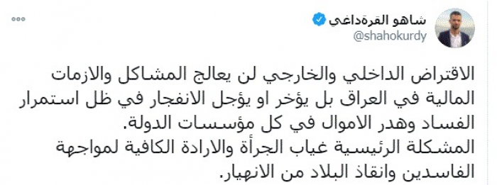 وكتب في تغريدة عبر "تويتر" رصدها "المشهد العربي": "الاقتراض الداخلي والخارجي لن يعالج المشاكل والازمات المالية في العراق بل يؤخر أو يؤجل الانفجار في ظل استمرار الفساد وهدر الأموال في كل مؤسسات الدولة".