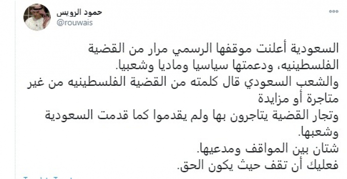 وقال في تغريدة عبر "تويتر" رصدها "المشهد العربي": "السعودية أعلنت موقفها الرسمي مرار من القضية الفلسطينيه، ودعمتها سياسيا وماديا وشعبيا. والشعب السعودي قال كلمته من القضية الفلسطينيه من غير متاجرة أو مزايدة".
