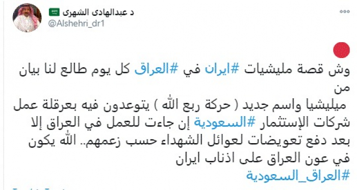 وقال في تغريدة عبر "تويتر" رصدها "المشهد العربي": "وش قصة مليشيات إيران في العراق كل يوم طالع لنا بيان من مليشيا واسم جديد ( حركة ربع الله ) يتوعدون فيه بعرقلة عمل شركات الاستثمار السعودية إن جاءت للعمل في العراق إلا بعد دفع تعويضات لعوائل الشهداء حسب زعمهم.. الله يكون في عون العراق على أذناب إيران".