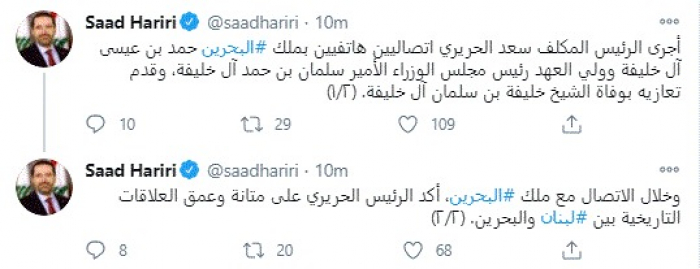 وقال في تغريدات عبر "تويتر" رصدها "المشهد العربي": "أجرى الرئيس المكلف سعد الحريري اتصاليين هاتفيين بملك البحرين حمد بن عيسى آل خليفة وولي العهد رئيس مجلس الوزراء الأمير سلمان بن حمد آل خليفة، وقدم تعازيه بوفاة الشيخ خليفة بن سلمان آل خليفة".