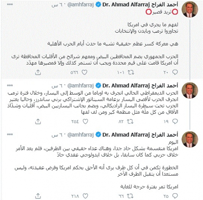 وكتب في سلسلة تغريدات عبر "تويتر" رصدها "المشهد العربي": "لفهم ما يجري في أمريكا تجاوزوا ترمب وبايدن والإنتخابات هي معركة كسر عظم حقيقية تشبه ما حدث أيام الحرب الأهلية".