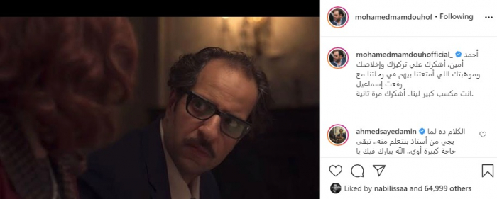 وجه الفنان محمد ممدوح رسالة شكر وإشادة للفنان أحمد أمين بعد نجاح دوره فى مسلسل "ما وراء الطبيعة"، حيث جسد شخصية رفعت إسماعيل، حيث نشر صورة أمين عبر إنستجرام، وعلق عليها "أحمد أمين، أشكرك على تركيزك وإخلاصك وموهبتك اللى أمتعتنا بيها فى رحلتنا مع رفعت إسماعيل.. إنت مكسب كبير لينا.. أشكرك مرة تانية".