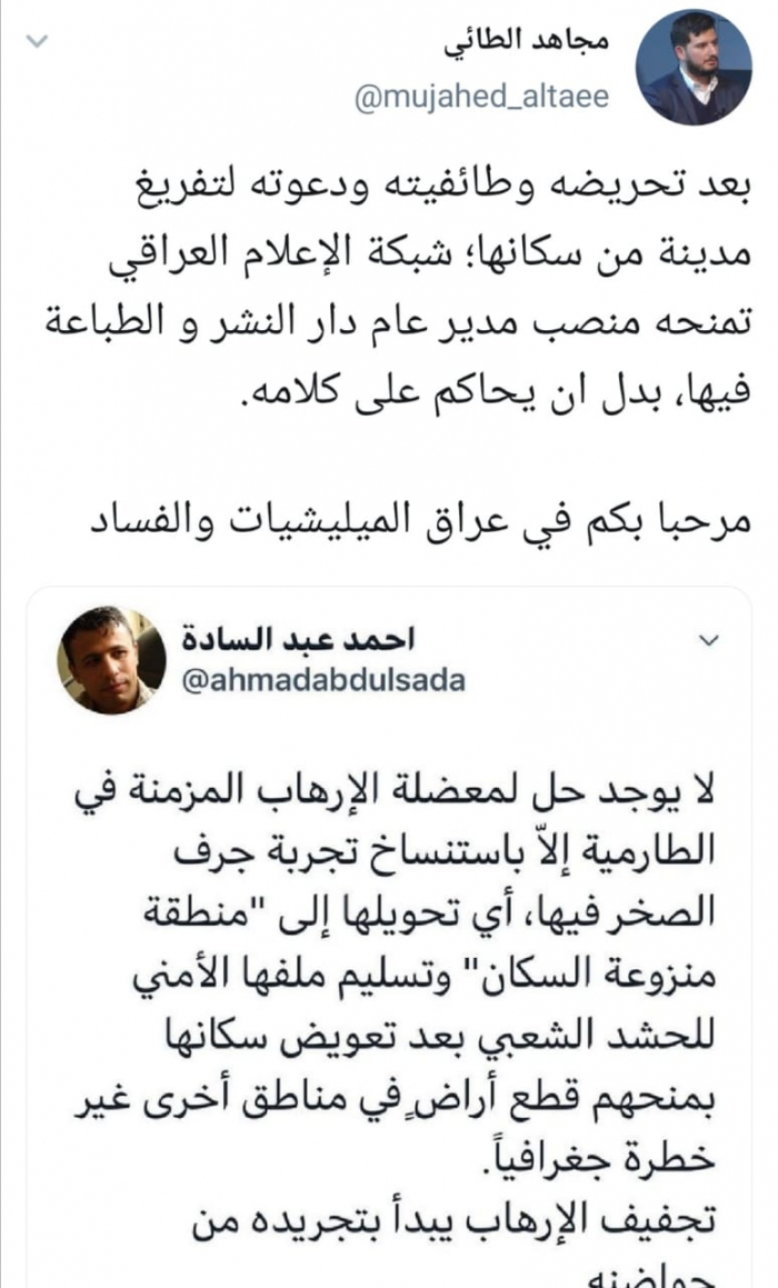 وقال الطائي في تغريدة له عبر حسابه بتويتر ورصدها "المشهد العربي": "بعد تحريضه وطائفيته ودعوته لتفريغ مدينة من سكانها؛ شبكة الإعلام العراقي تمنحه منصب مدير عام دار النشر و الطباعة فيها، بدل ان يحاكم على كلامه".