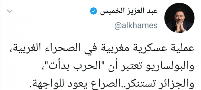 وقال الخميس في تغريدة عبر حسابه بتويتر ورصدها "المشهد العربي" : "عملية عسكرية مغربية في الصحراء الغربية، والبوليساريو تعتبر أن الحرب بدأت"، مضيفا "الجزائر تستنكر..الصراع يعود للواجهة".