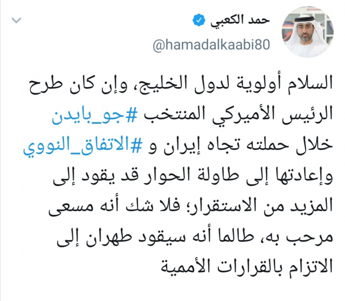 وقال الكعبي في تغريدة له عبر حسابه بتويتر ورصدها المشهد العربي: "السلام أولوية لدول الخليج، وإن كان طرح الرئيس الأميركي المنتخب جو بايدن خلال حملته تجاه إيران والاتفاق النووي وإعادتها إلى طاولة الحوار قد يقود إلى المزيد من الاستقرار؛ فلا شك أنه مسعى مرحب به، طالما أنه سيقود طهران إلى الاتزام بالقرارات الأممية.