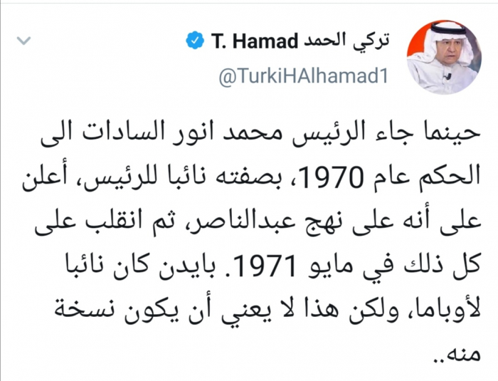 وقال الحمد في تغريدة له عبر حسابه بتويتر ورصدها "المشهد العربي": "حينما جاء الرئيس محمد أنور السادات إلى الحكم عام 1970، بصفته نائبا للرئيس، أعلن على أنه على نهج عبدالناصر، ثم انقلب على كل ذلك في مايو 1971. بايدن كان نائبا لأوباما، ولكن هذا لا يعني أن يكون نسخة منه".