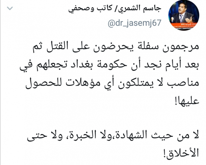 وقال الشمري في تغريدة له عبر حسابه بتويتر ورصدها "المشهد العربي" : "مرجمون سفلة يحرضون على القتل ثم بعد أيام نجد أن حكومة بغداد تجعلهم في مناصب لا يمتلكون أي مؤهلات للحصول عليها، لا من حيث الشهادة،ولا الخبرة، ولا حتى الأخلاق".
