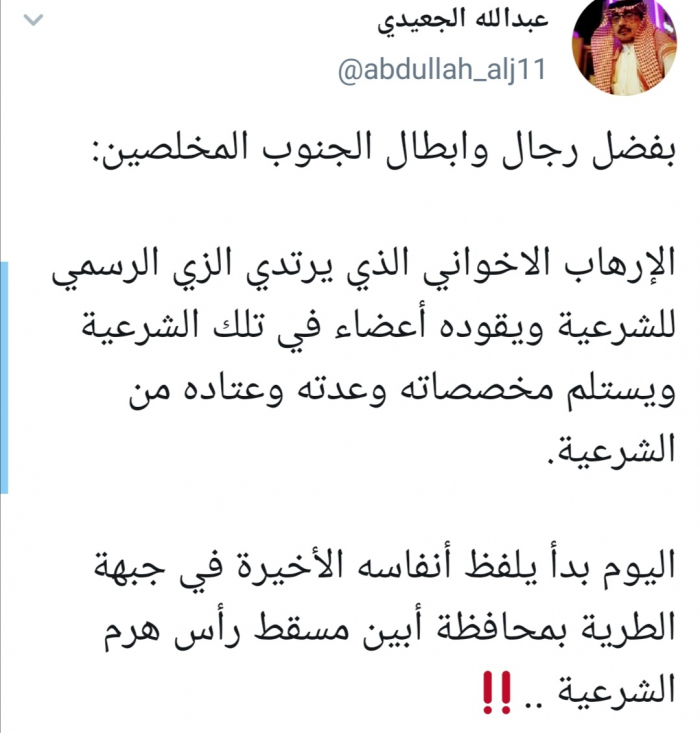 وقال الجعيدي عبر حسابه في تويتر ورصدها "المشهد العربي": "بفضل رجال وأبطال الجنوب المخلصين: الإرهاب الإخواني الذي يرتدي الزي الرسمي للشرعية ويقوده أعضاء في تلك الشرعية ويستلم مخصصاته وعدته وعتاده من الشرعية".
