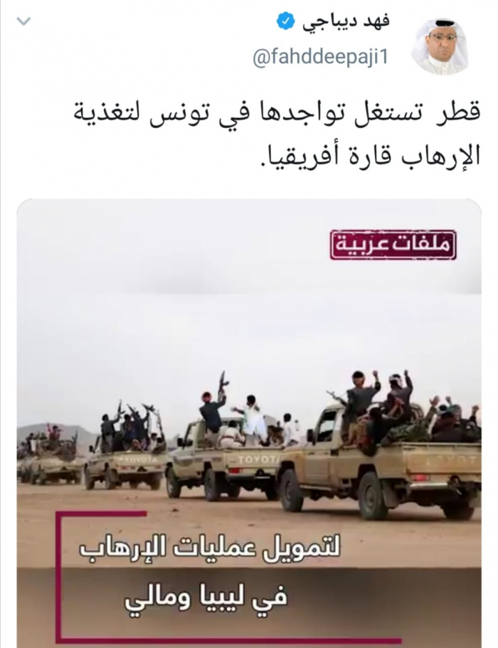 وقال ديباجي عبر حسابه في تويتر ورصدها "المشهد العربي": "قطر تستغل تواجدها في تونس لتغذية الإرهاب في قارة أفريقيا".