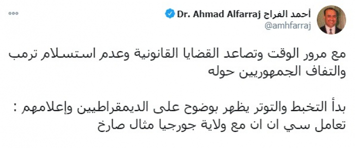 وكتب في تغريدة عبر "تويتر" رصدها "المشهد العربي": "مع مرور الوقت وتصاعد القضايا القانونية وعدم استسلام ترمب والتفاف الجمهوريين حوله بدأ التخبط والتوتر يظهر بوضوح على الديمقراطيين وإعلامهم : تعامل سي ان ان مع ولاية جورجيا مثال صارخ".