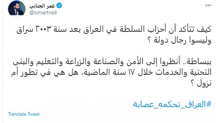 وقال في تغريدة عبر "تويتر" رصدها "المشهد العربي": "كيف تتأكد أن أحزاب السلطة في العراق بعد سنة ٢٠٠٣ سراق وليسوا رجال دولة؟ ببساطة.. أنظروا إلى الأمن والصناعة والزراعة والتعليم والبنى التحتية والخدمات خلال ١٧ سنة الماضية، هل هي في تطور أم نزول ؟".
