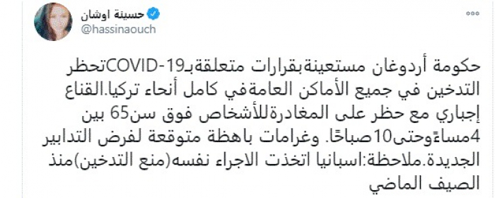 وأضافت: "القناع إجباري مع حظر على المغادرة للأشخاص فوق سن65 بين 4مساءًوحتى10صباحًا. وغرامات باهظة متوقعة لفرض التدابير الجديدة. ملاحظة:اسبانيا اتخذت الاجراء نفسه(منع التدخين)منذ الصيف الماضي".