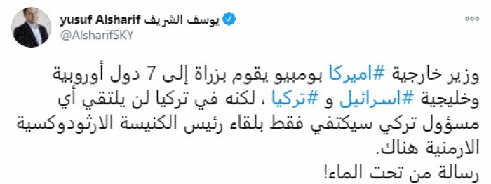 وقال في تغريدة عبر "تويتر" رصدها "المشهد العربي": "وزير خارجية أميركا بومبيو يقوم بزيارة إلى 7 دول أوروبية وخليجية وإسرائيل وتركيا ، لكنه في تركيا لن يلتقي أي مسؤول تركي سيكتفي فقط بلقاء رئيس الكنيسة الأرثودوكسية الأرمينية هناك. رسالة من تحت الماء".