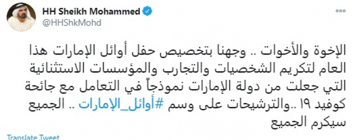 وقال في تغريدة عبر "تويتر" رصدها "المشهد العربي": " الإخوة والأخوات .. وجهنا بتخصيص حفل أوائل الإمارات هذا العام لتكريم الشخصيات والتجارب والمؤسسات الاستثنائية التي جعلت من دولة الإمارات نموذجاً في التعامل مع جائحة كوفيد ١٩ ..والترشيحات على وسم أوائل الإمارات .. الجميع سيكرم الجميع".
