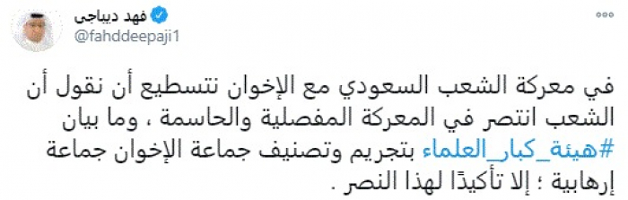 ديباجي: الشعب السعودي انتصر في المعركة الحاسمة ضد الإخوان