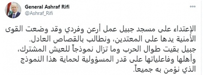 وقال في تغريدة عبر "تويتر" رصدها "المشهد العربي": "الاعتداء على مسجد جبيل عمل أرعن وفردي وقد وضعت القوى الأمنية يدها على المعتدين، ونطالب بالقصاص العادل".
