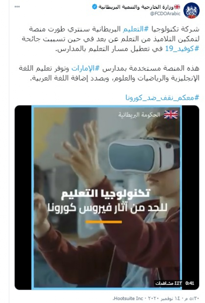 وكتب حساب "الخارجية البريطانية" بمنصة تويتر، تغريدة رصدها "المشهد العربي": " شركة تكنولوجيا التعليم البريطانية، سنتري، طورت منصة لتمكين التلاميذ من التعلم عن بعد في حين تسببت جائحة (كوفيد_19) في تعطيل مسار التعليم بالمدارس"..