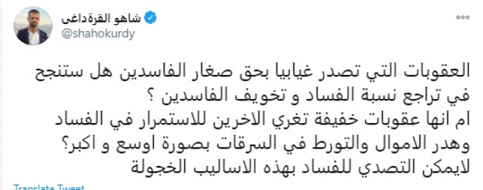 طالب الكاتب الصحفي العراقي شاهو القرةداغي، اليوم، بالتصدي للفساد في العراق بأساليب أكثر صرامة، وتوقيع عقوبات رادعة.