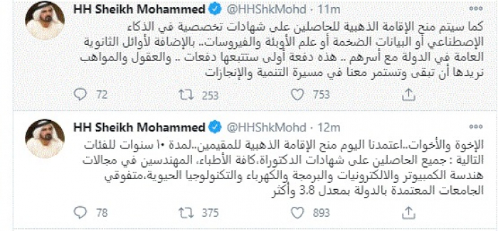 وقال في تغريدات عبر "تويتر" رصدها "المشهد العربي": "الإخوة والأخوات..اعتمدنا اليوم منح الإقامة الذهبية للمقيمين..لمدة ١٠ سنوات للفئات التالية : جميع الحاصلين على شهادات الدكتوراة،كافة الأطباء، المهندسين في مجالات هندسة الكمبيوتر والالكترونيات والبرمجة والكهرباء والتكنولوجيا الحيوية،متفوقي الجامعات المعتمدة بالدولة بمعدل 3.8 وأكثر".
