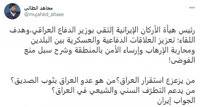 وكتب في تغريدة عبر "تويتر" رصدها "المشهد العربي": "رئيس هيئة الأركان الإيرانية إلتقى بوزير الدفاع العراقي، وهدف اللقاء؛ تعزيز العلاقات الدفاعية والعسكرية بين البلدين ومحاربة الإرهاب وإرساء الأمن بالمنطقة وشرح سبل منع الفوضى! من يزعزع استقرار العراق؟ من هو عدو العراق بثوب الصديق؟ من يدعم التطرّف السني والشيعي في العراق؟ الجواب إيران".